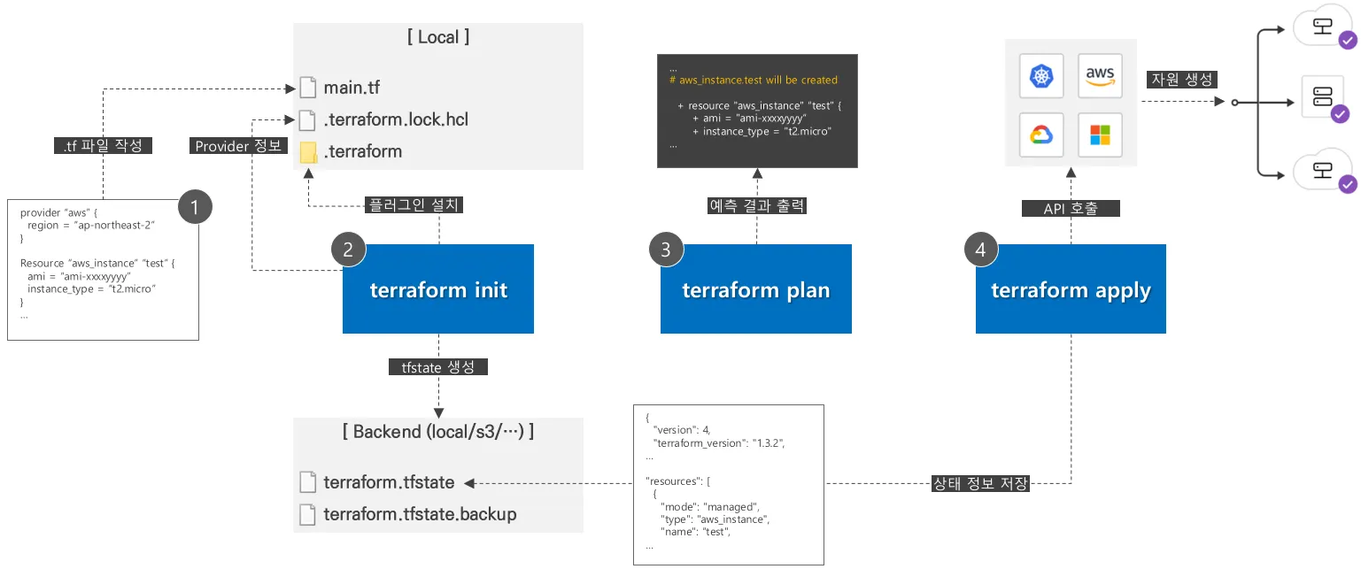 Provider와 API 연계하여 자원을 생성하며, 상태 정보를 백엔드 영역에 .tfstate 파일로 저장합니다.
