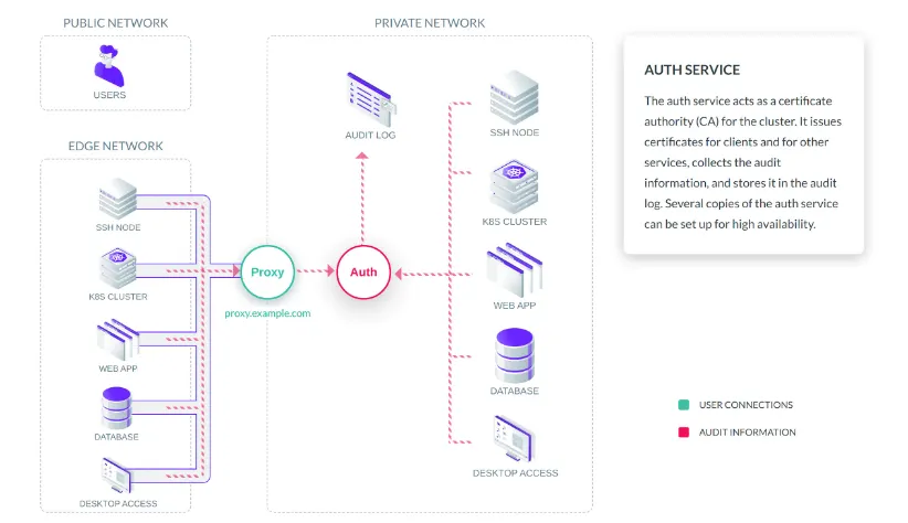 Teleport Auth Service는 Teleport 클러스터 내의 사용자 및 리소스를 관리합니다.