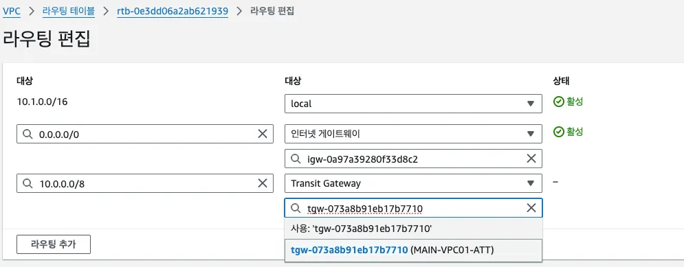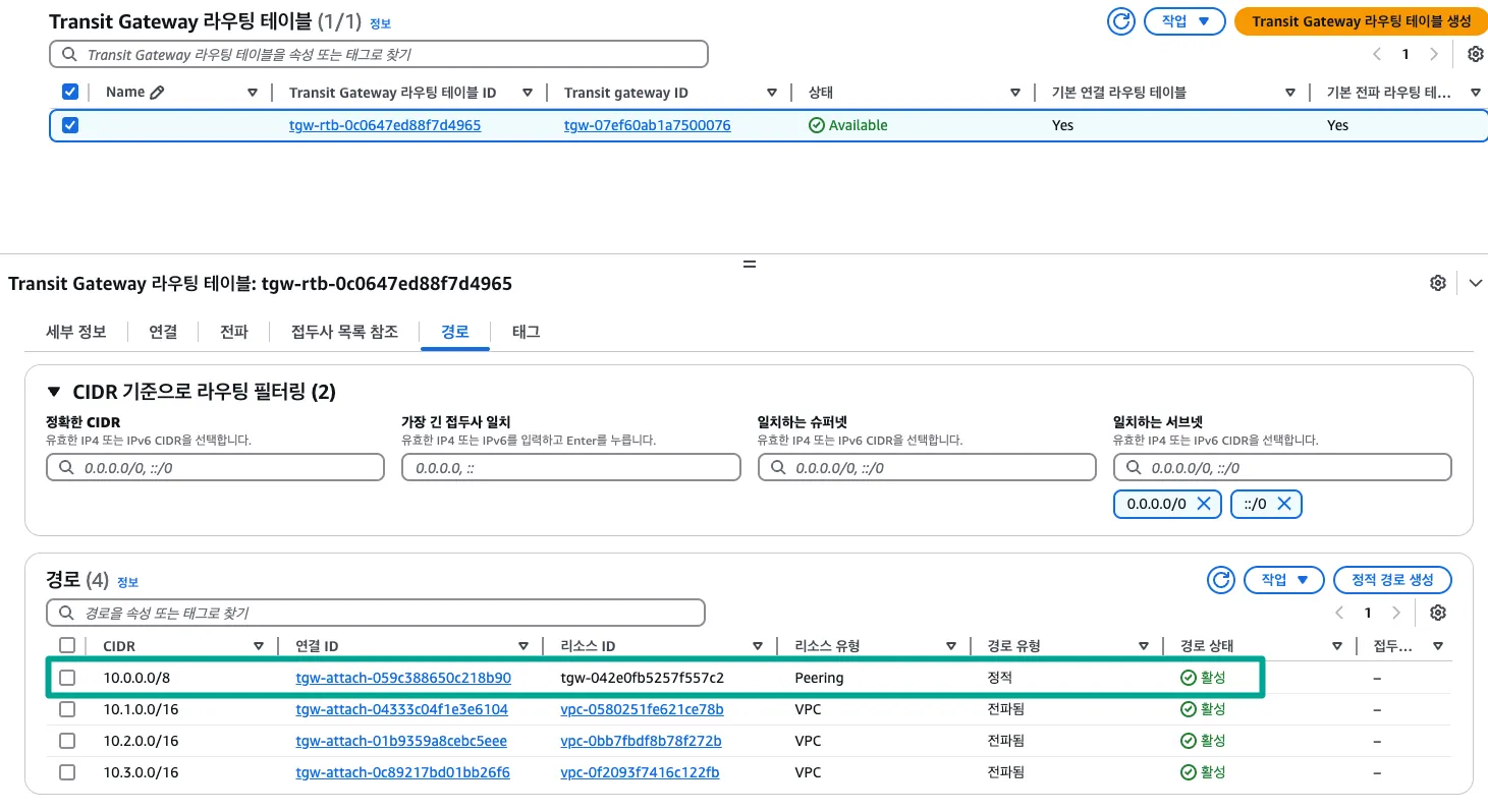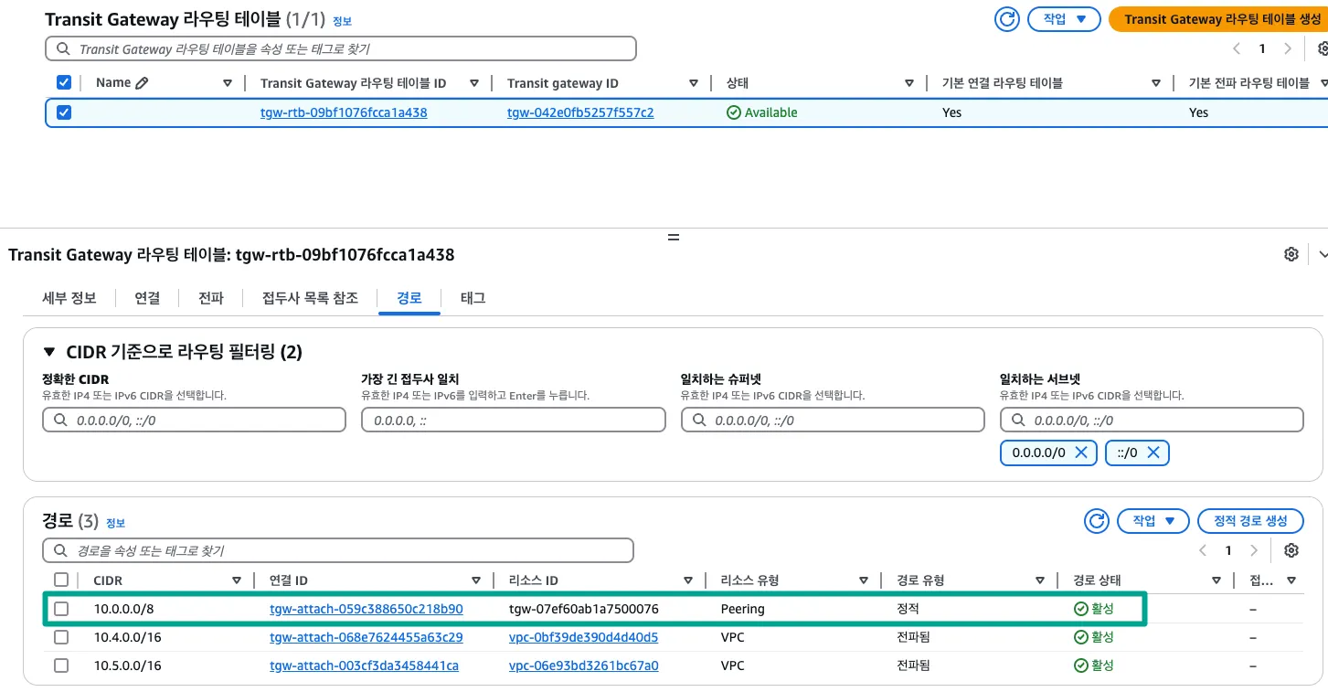 VPC → Transit Gateway 라우팅 테이블 → 대상 지정 → 경로 탭 → 정적 경로 생성