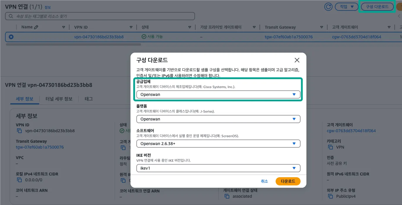 서울에 OpenSwan VPN 서버를 설치 후 TGW와 연결