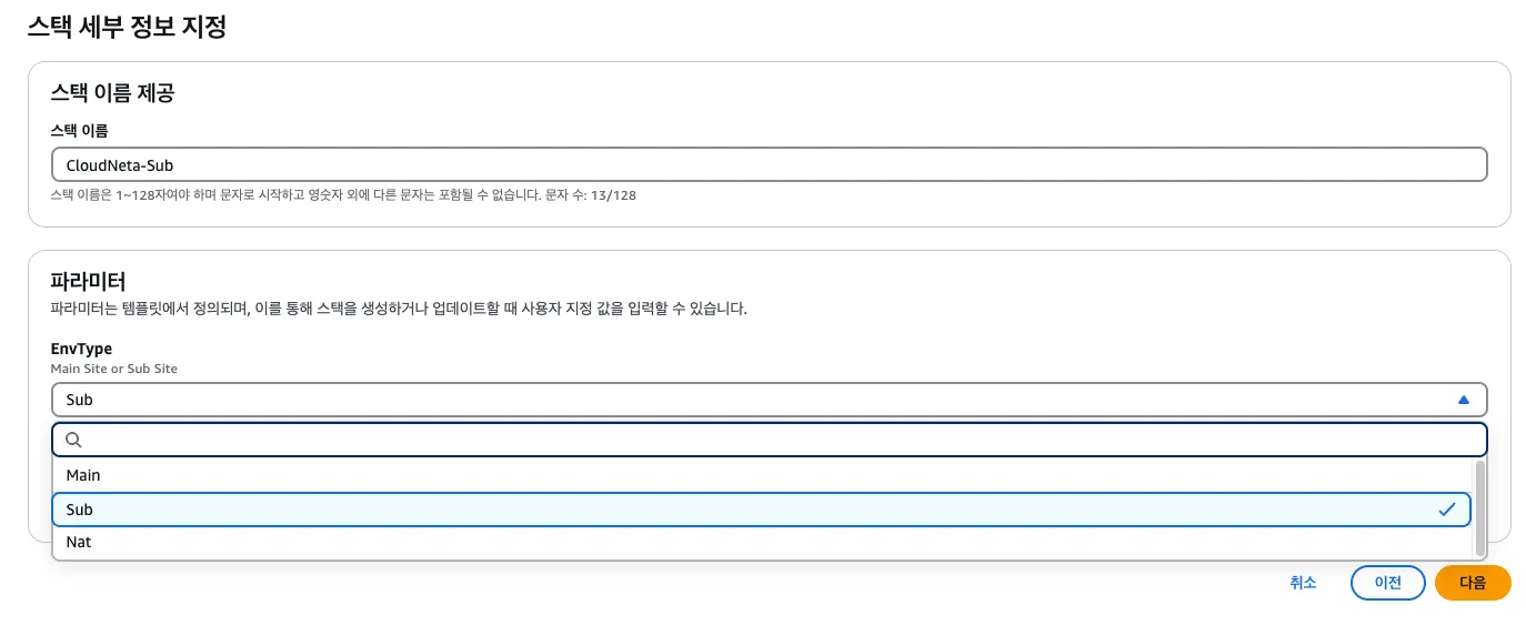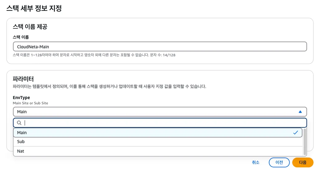 해당 작업은 AWS 본 계정에서 진행하며, EnvType은 Nat로 지정합니다.