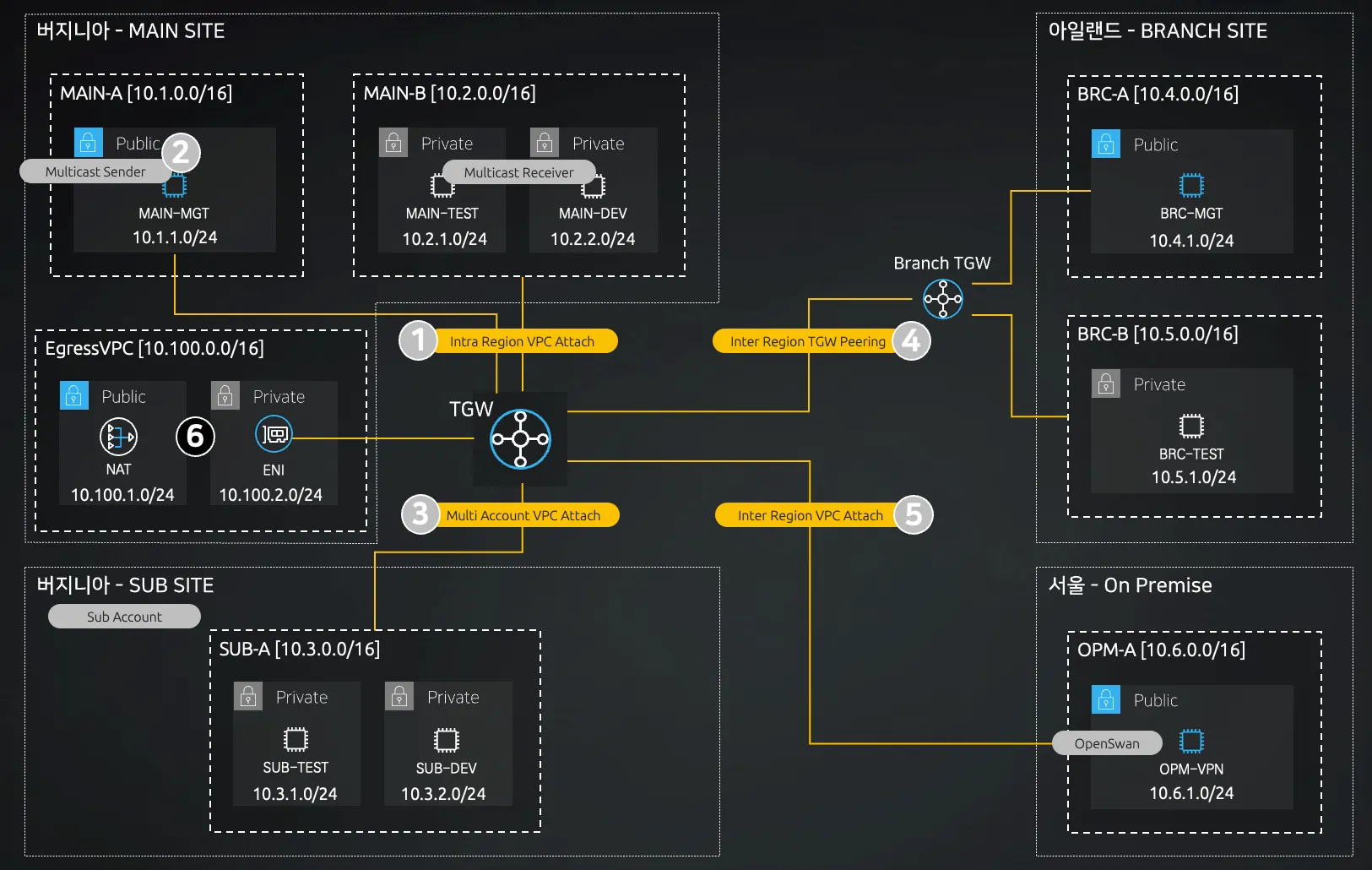 다른 계정의 버지니아 북부에 SUB SITE 구축 후 Resource Access Manager를 통해 TGW를 공유하고 다른 계정의 VPC와 연결