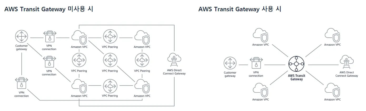 [Caption] Transit Gateway 미사용 / 사용 비교