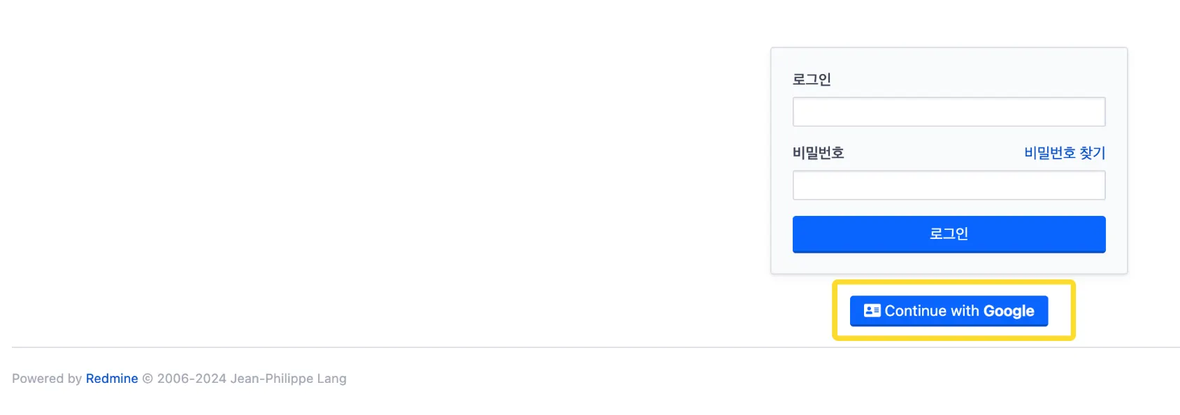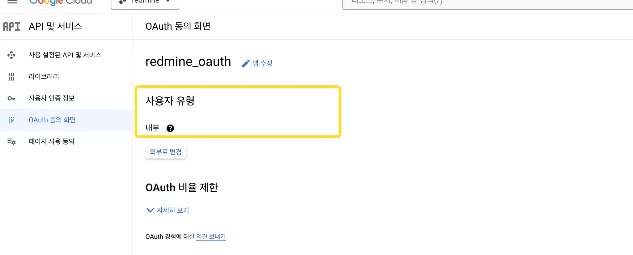 ⇒ redmine OAuth 설정으로 사용자 유형을 내부로 지정해서 회사 조직 계정만 접근할 수 있습니다.
