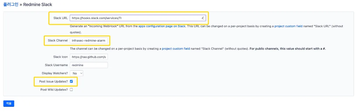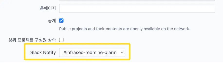 - 프로젝트 탭에서 Slack Notify : #infrasec-redmine-alarm ← 선택