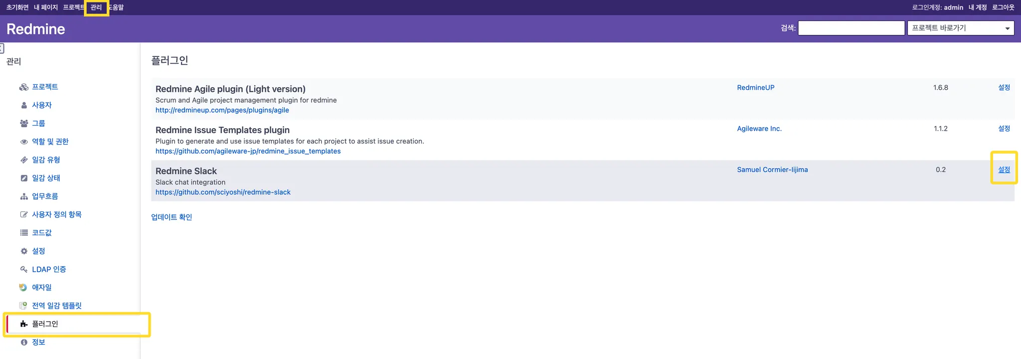 redmine 관리자 권한 계정에서 작업 (최초 생성한 admin 계정)