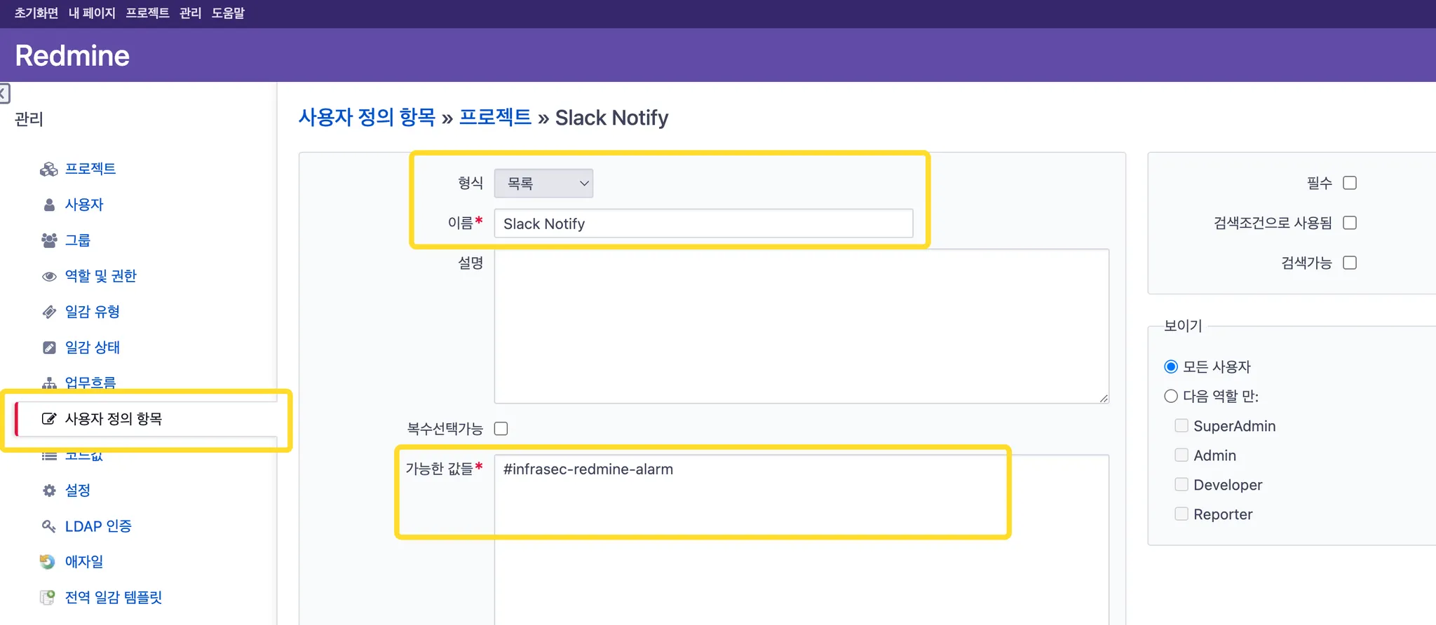 redmine 사용자 정의 항목 설정 (관리 → 사용자 정의 항목 → 새 사용자 정의 항목)