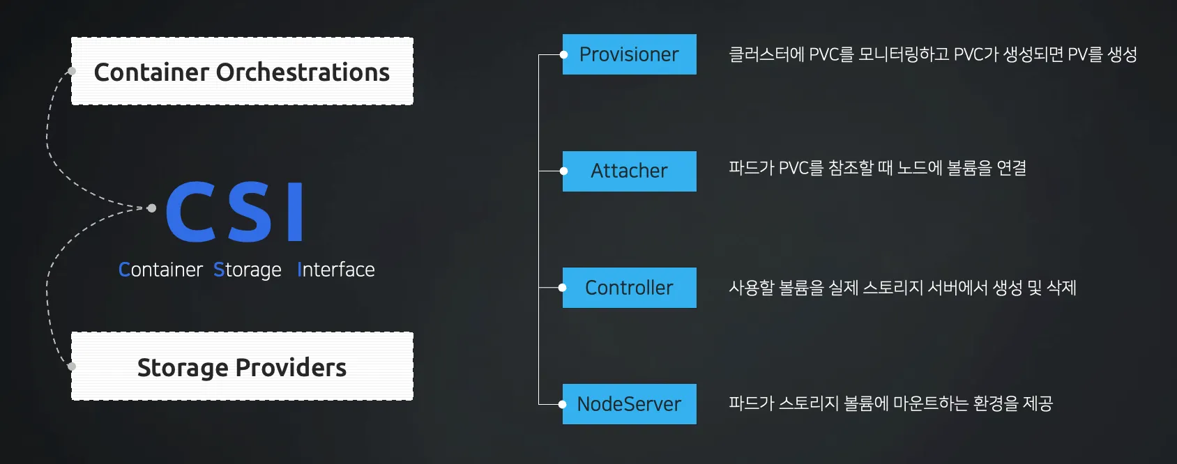 스토리지 시스템과 쿠버네티스 간의 연결을 표준화 합니다.