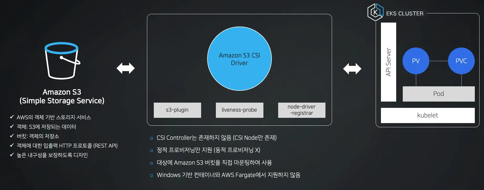 : Amazon S3(Simple Storage Service)를 쿠버네티스 클러스터에서 사용할 수 있도록 지원하는 CSI 드라이버입니다.