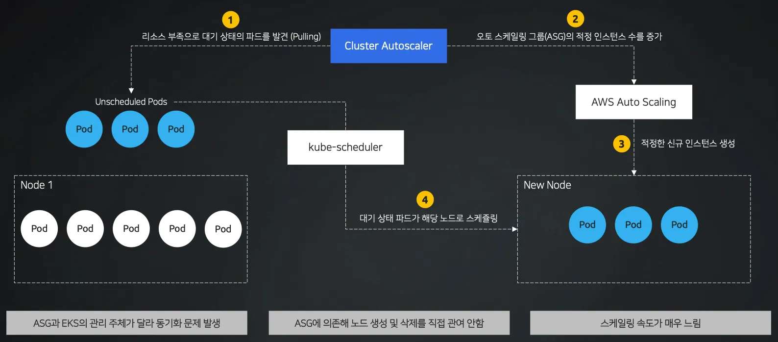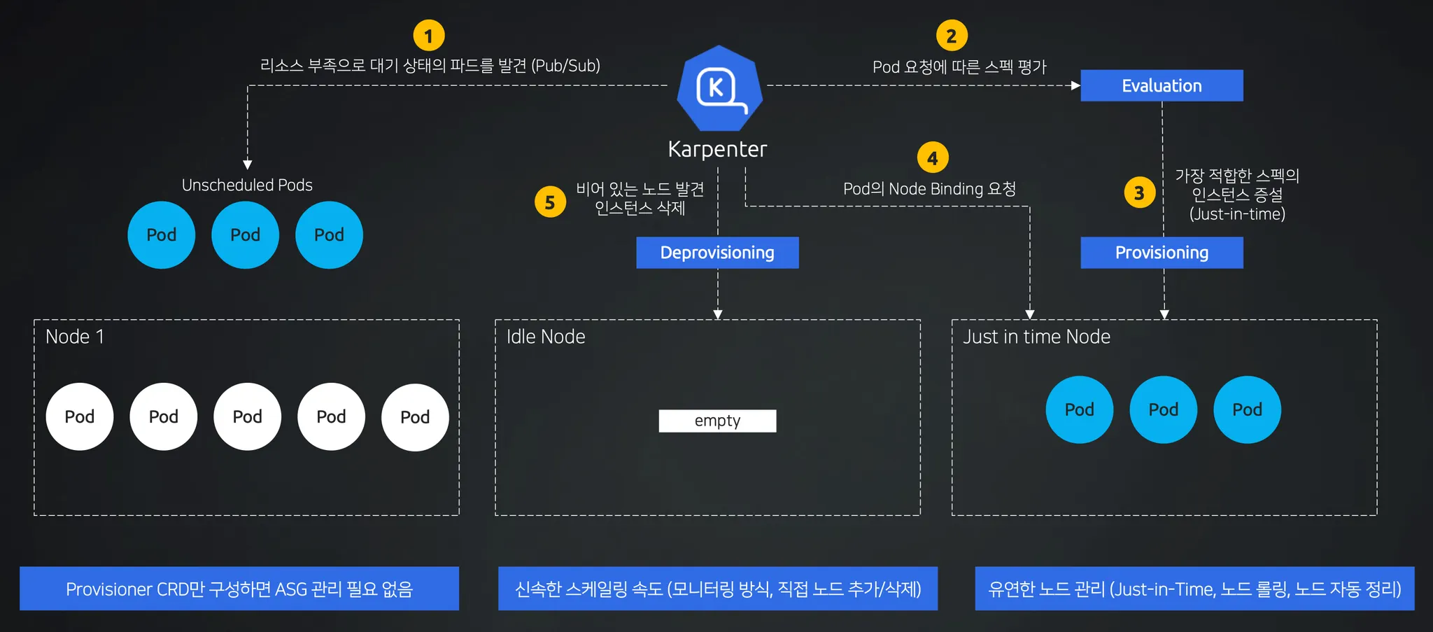 Karpenter는 CA와 다르게 ASG에 의존하지 않고 직접 EC2 인스턴스를 프로비저닝하고 관리하여 더 빠르고 유연한 스케일링을 제공합니다.