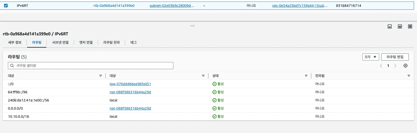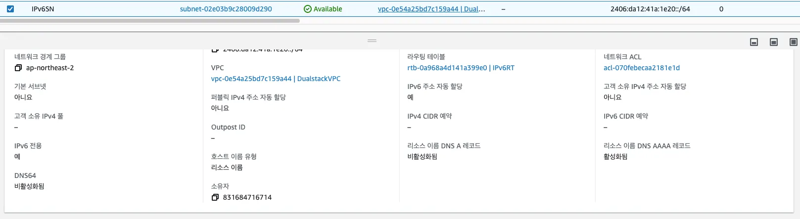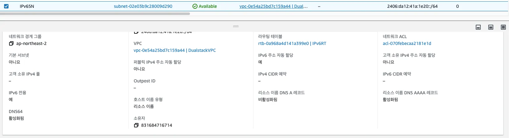 IPv6Host가 속한 서브넷의 라우팅 테이블을 확인하면 미리 Well-Known Prefix(64:ff9b::/96)에 대해 NAT GW로 향하는 경로로 설정니다.