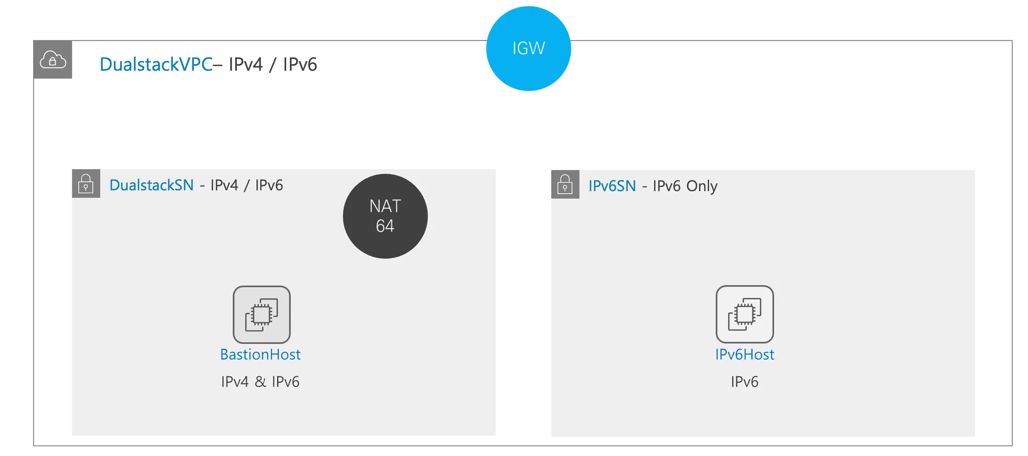 또한 통신을 위해 IPv6를 IPv4로 변환하는 NAT64 동작이 필요하며, NAT Gateway를 생성하면 별도의 설정 없이 동작 가능합니다.